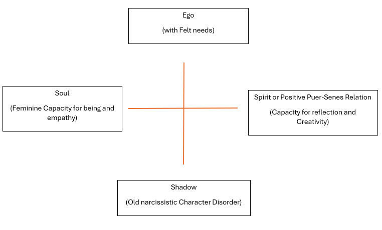 - Disturbed masculine and feminine functioning: the feminine realm of being (relatedness to the self) is absent, crushed by the power drive and compulsion of the inflated ego. The value of self is usurped by ego, whereby the positive significance of suffering is denied, oriented towards outer appearance rather than inner beauty and growth. When the positive anima (inner feminine) is present, there is potential for internal mirroring for the ego and self to enter into a relationship. The emergence of a positive animus (inner masculine) yields reflection and objectivity. transformation of the contra-sexual components results in a capacity for union and outer relationships, with the resurrection of the connection archetype.